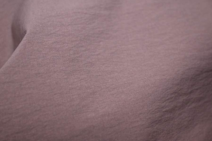 视觉表现:布面呈消光质感,带有染皱工艺形成的自然纹理,色彩雅致(如深藕荷色),垂坠自然且具复古随性的视觉风格。